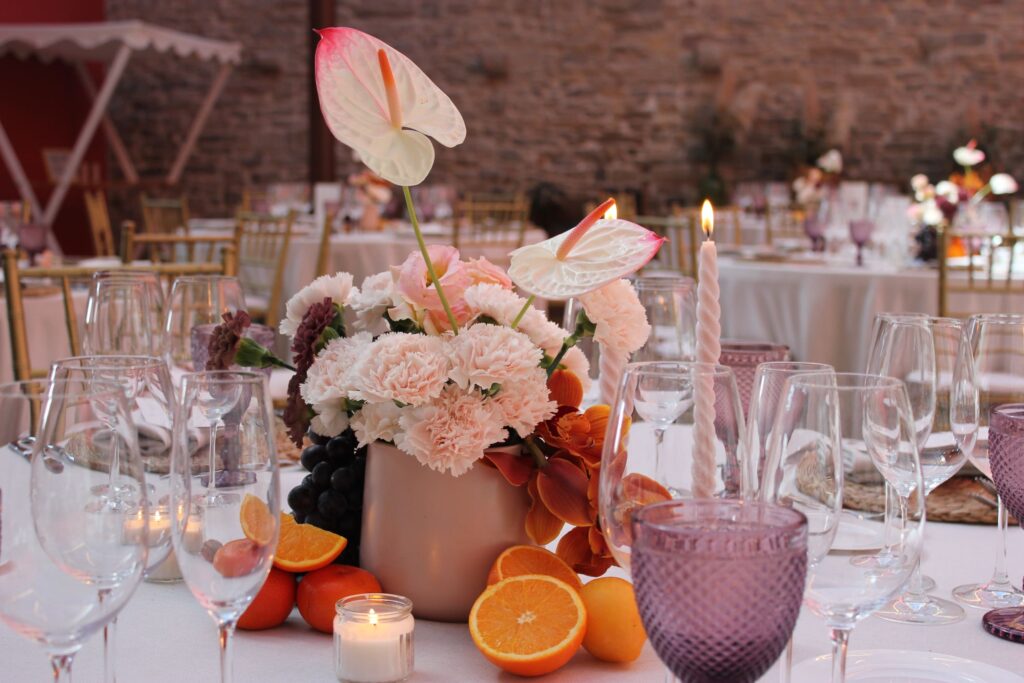 Cada boda tiene su propia energía. Algunas son íntimas y delicadas, otras son más vibrantes y llenas de color. Los centros de mesa pueden reflejar esa personalidad a través de la elección de flores, de la escala de las composiciones o de la forma en que se distribuyen sobre la mesa. No se trata de repetir fórmulas, sino de crear piezas que nazcan desde una hoja en blanco, pensadas específicamente para ese momento.